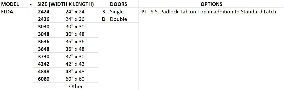 Latch: 304 Stainless steel slam latch with flush key operator on exterior and handle opener on inside. Removable stainless 18-8 threaded plug and 5/16″ steel square key included.