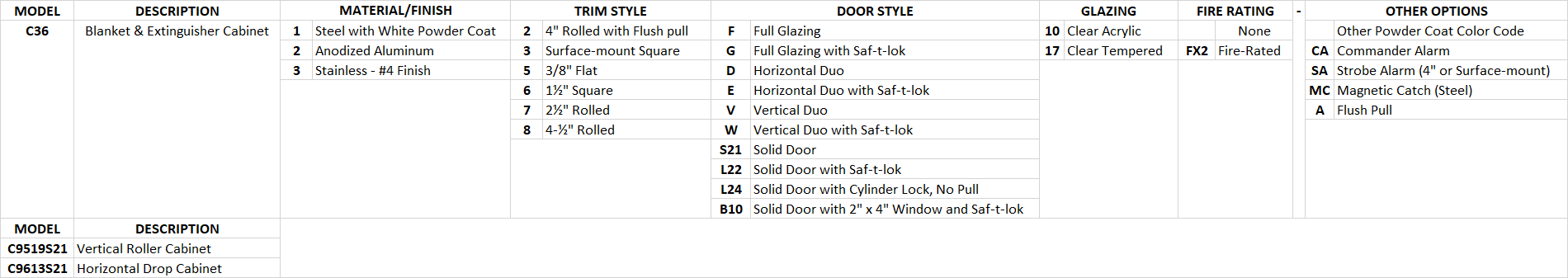 3600 Combination Extinguisher/Blanket Models are available in steel, anodized aluminum or 304 stainless steel with ten door styles to choose from. Five recessed cabinet configurations and a surface-mounted version provide plenty of installation options.