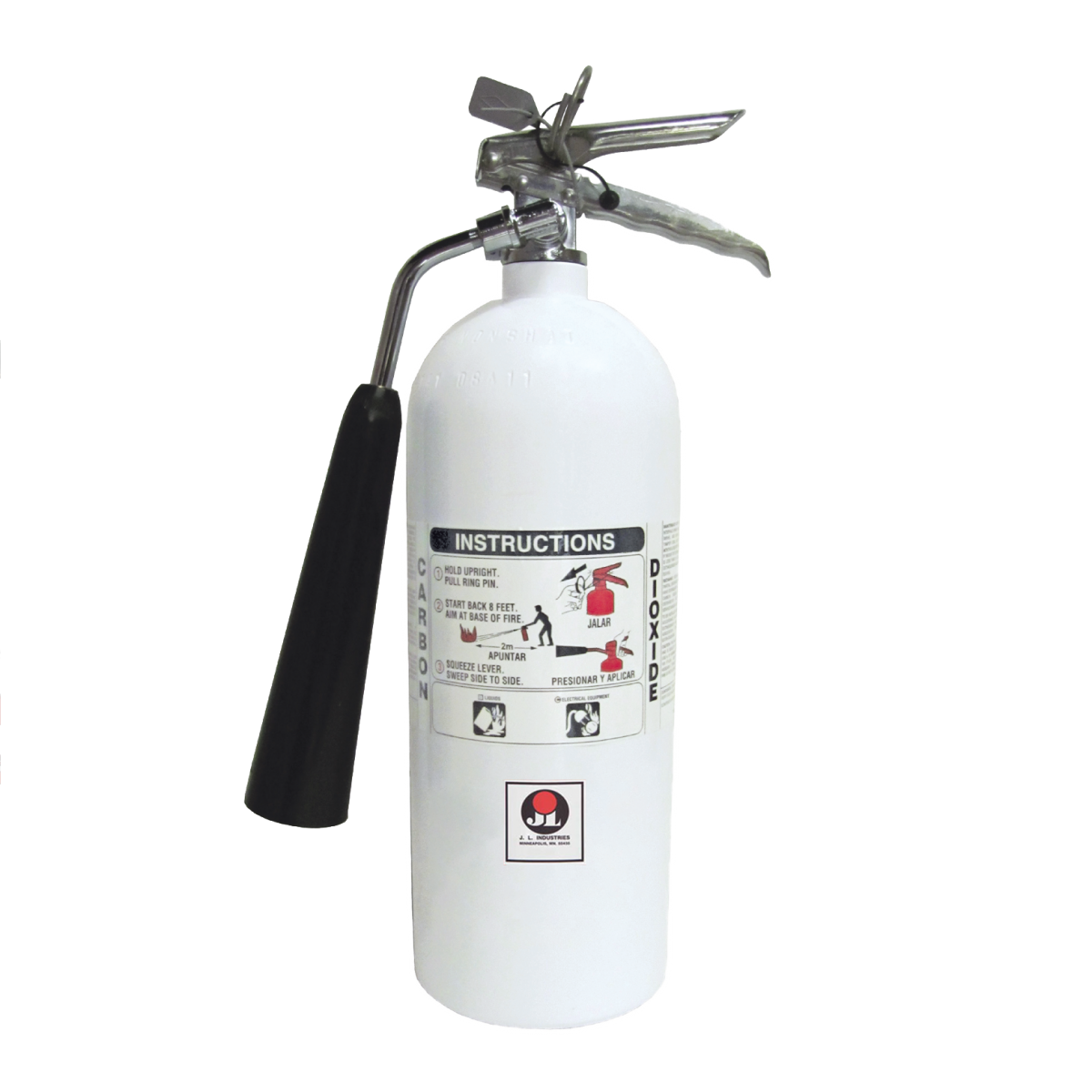 Operation: Squeeze the lever, which opens the valve, allowing the carbon dioxide to be forced out. The discharge, which changes into a gas and appears as a smothering cloud of white snow, is then directed to the fire through a funnel-shaped horn. Electrically non-conductive.